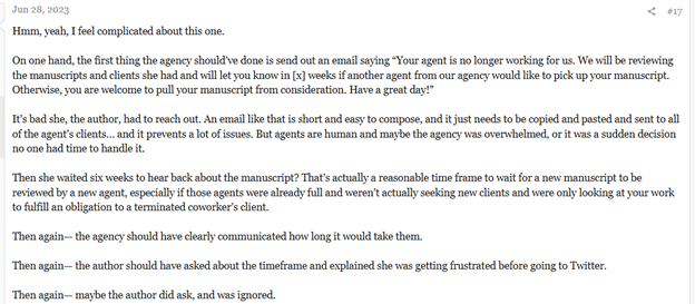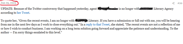 My agent…. Had been fired? Quit? I looked at the date. It was literally right around the time I sent my revisions! Immediately I plunged into the thread. It was all over the place with side conversations, but I found this piece…