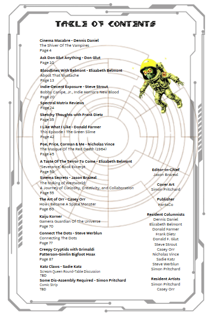 Have you been left wondering about this latest Nosferatu critter and his infamous mustache? Well look no further, because resident vampire authority Elizabeth Belmont takes a health bite out of the vampire mythos for you with the loving care that only a historian can do! Don’t miss Bloodline With Belmont, in this issue of Space Monsters Magazine, if you dare!